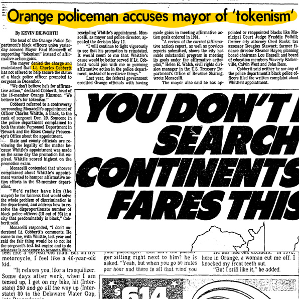 Cobbertt referred to a controversy surrounding Monacelli's appointment of Officer Charles Whittle, a black, to the rank of sergeant Dec. 29. Some in the police department complained to both the state Personnel Department in Newark and the Essex County Prosecutor's Office about the appointment.