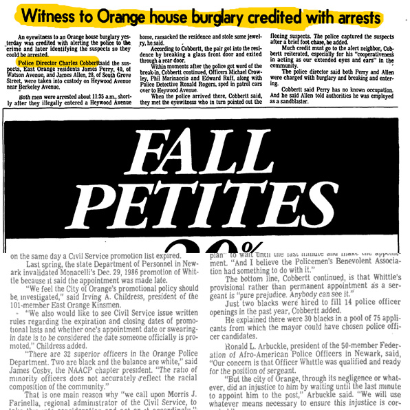 Within moments after the police got word of the break-in, Cobbertt continued, Officers Michael Crowley, Phil Marinaccio and Edward Ruff, along with Police Detective Ronald Rogers, sped in patrol cars over to Heywood Avenue.