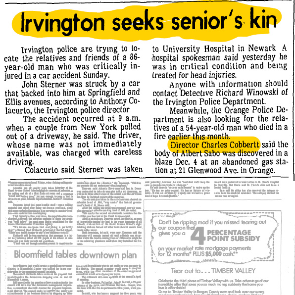 John Sterner was struck by a car that backed into him at Springfield and Ellis avenues, according to Anthony Colacurto, the Irvington police director.