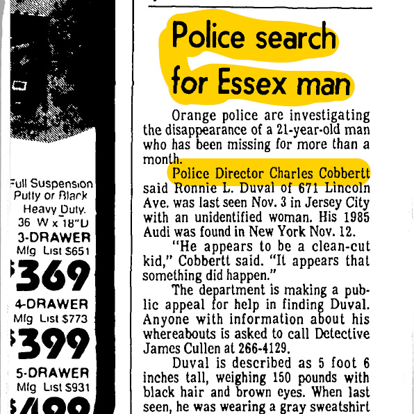 Police Director Charles Cobbertt said Ronnie L. Duval of 671 Lincoln Ave. was last seen Nov. 3 in Jersey City with an unidentified woman. his 1985 Audi was found in New York Nov. 12.