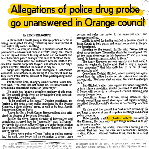 Speaking to the council, Zarillo said, "We're talking about narcotics here. The matter should be investigated. We got too many clean cops in this department" who are being forced "to have a stigma attached to them."