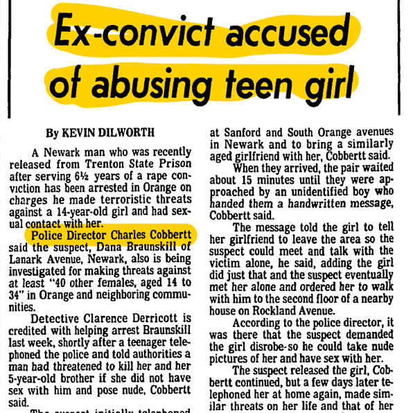 In addition to the Orange police, the sex crimes unit of Essex County Prosecutor's Office is investigating Braunskill. Cobbertt said Braunskill was released from prison five months ago.