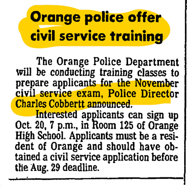 Interested applicants can sign up Oct. 20, 7 p.m., in Room 125 of Orange High School. Applicants must be a resident of Orange and should have obtained a civil service application before Aug. 29 deadline.