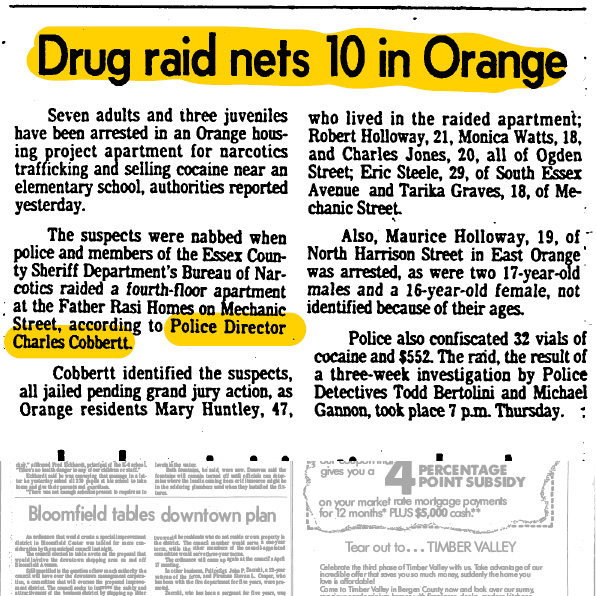 Cobbertt identified the suspects, all jailed pending grand jury action, as Orange residents Mary Huntley, 47, who lived in the raided apartment; Robert Holloway, 21, Monica Watts, 18, and Charles Jones, 20, all of Ogden Street; Eric Steel, 29, of South Essex Avenue and Tarika Graves, 18, of Mechanic Street.
