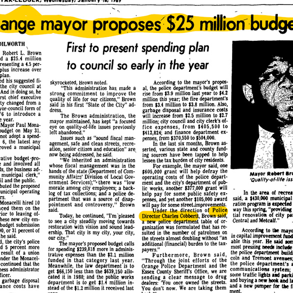 "We inherited an administration whose fiscal management was in the hands of the state (Department of Community Affairs' Division of Local Government Services)," there was "low morale among city employees; a backlog of tax collections; and a police department that was a source of disappointment and controversy," Brown said.