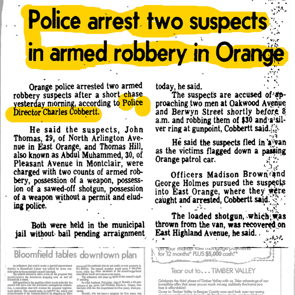 He said the suspects, John Thomas, 29, of North Arlington Avenue in East Orange, and Thomas Hill, also known as Abdul Muhammed, 30, of Pleasant Avenue in Montclair, were charged with two counts of armed robbery, possession of a weapon, possession of a sawed-off shotgun, possession of a weapon without permit and eluding police.