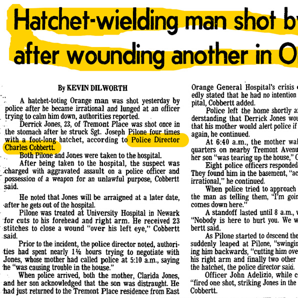 Derrick Jones, 23, of Tremont Place was shot once in the stomach after he struck Sgt. Joseph Pilone four times with a foot-long hatchet, according to Police Director Charles Cobbertt.