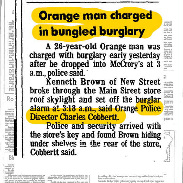 Kenneth Brown of New Street broke through the Main Street store roof skylight and set off the burglar alarm at 3:18 a.m., said Orange Police Director Charles Cobbertt.