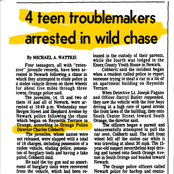The Orange police officers called Newark police for backup and continued trailing the stolen car. The juveniles abandoned the vehicle at a roadblock at Bergen Street and Shephard Avenue, said Cobbertt.