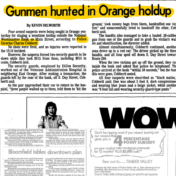The security guards, employed by Dillon Security, worked out of the Veterans Administration Hospital in neighboring East Orange. After making a transaction, the guards left by the rear of the bank, off S. Day Street, Cobbertt said.