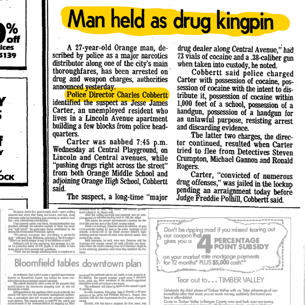 Carter was nabbed 7:45 p.m. Wednesday at Central Playground on Lincoln and Central avenues, while "pushing drugs right across the street" from both Orange Middle School and adjoining Orange High School, Cobbertt said.